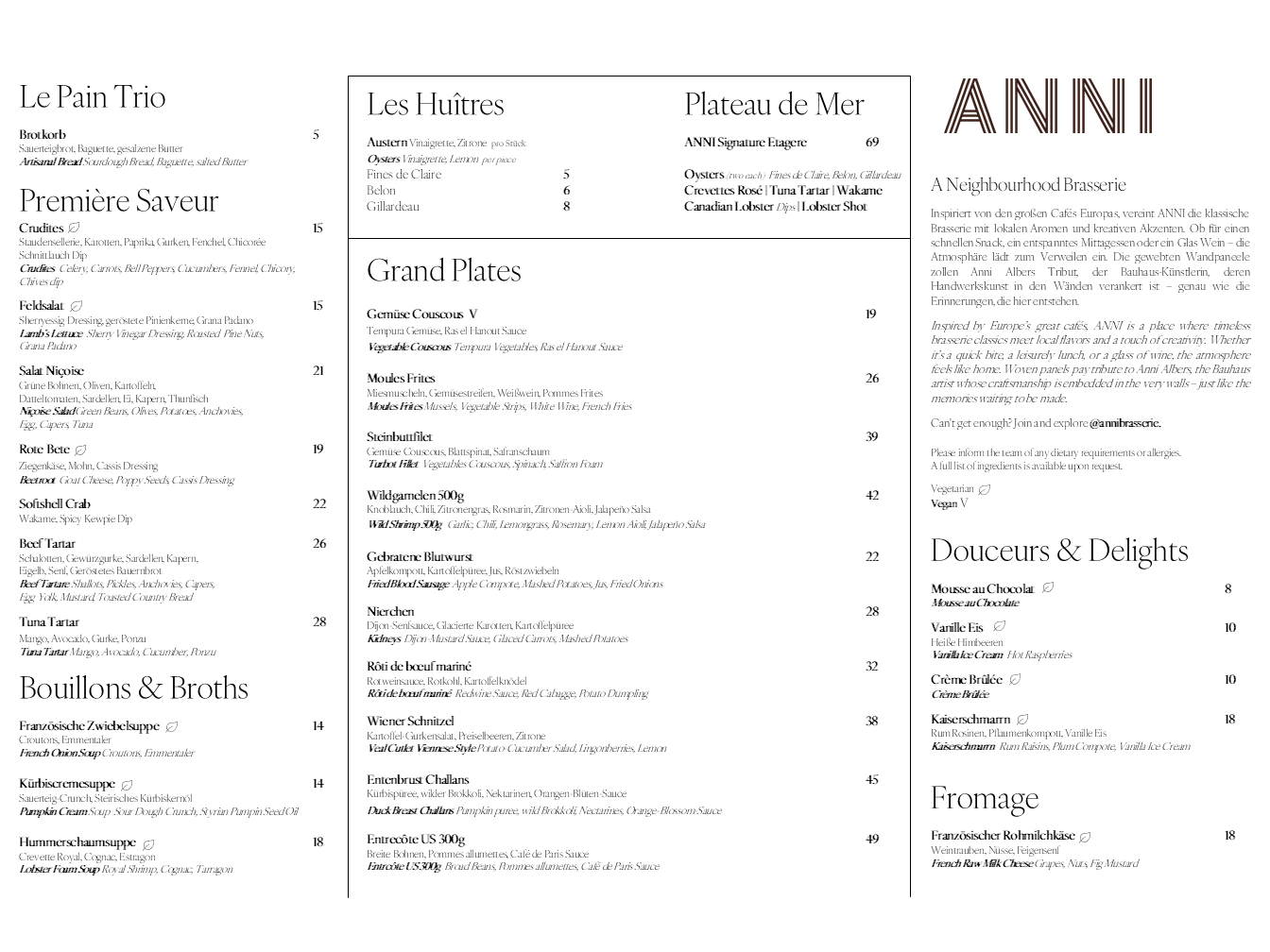 Mit einer Atmosphäre, die lebendig und dennoch spielerisch raffiniert ist, ist ANNI der Treffpunkt für all jene, die die kleinen Details lieben – das pulsierende Leben einer Brasserie, das Klirren edelster Gläser, der perfekte Bissen im richtigen Moment.